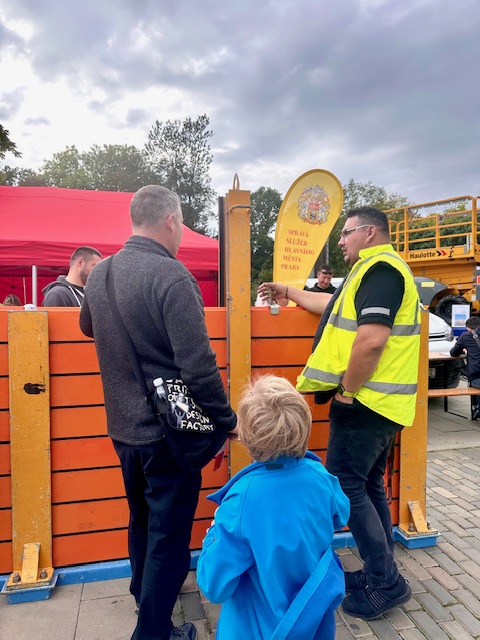 Správa služeb hlavního města Prahy přispěla atraktivní prezentací, kde nechyběla cvičná stěna protipovodňové ochrany, ukázky pracovních plošin, vyprošťovací pásové techniky i přepravních prostředků, které se využívají při stavbě protipovodňových opatření.